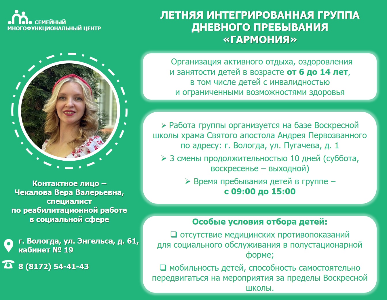 В летний период Территориальный центр социальной помощи семье и детям совместно с приходом Храма Святого апостола Андрея Первозванного ежегодно организуют группу дневного пребывания «Гармония».