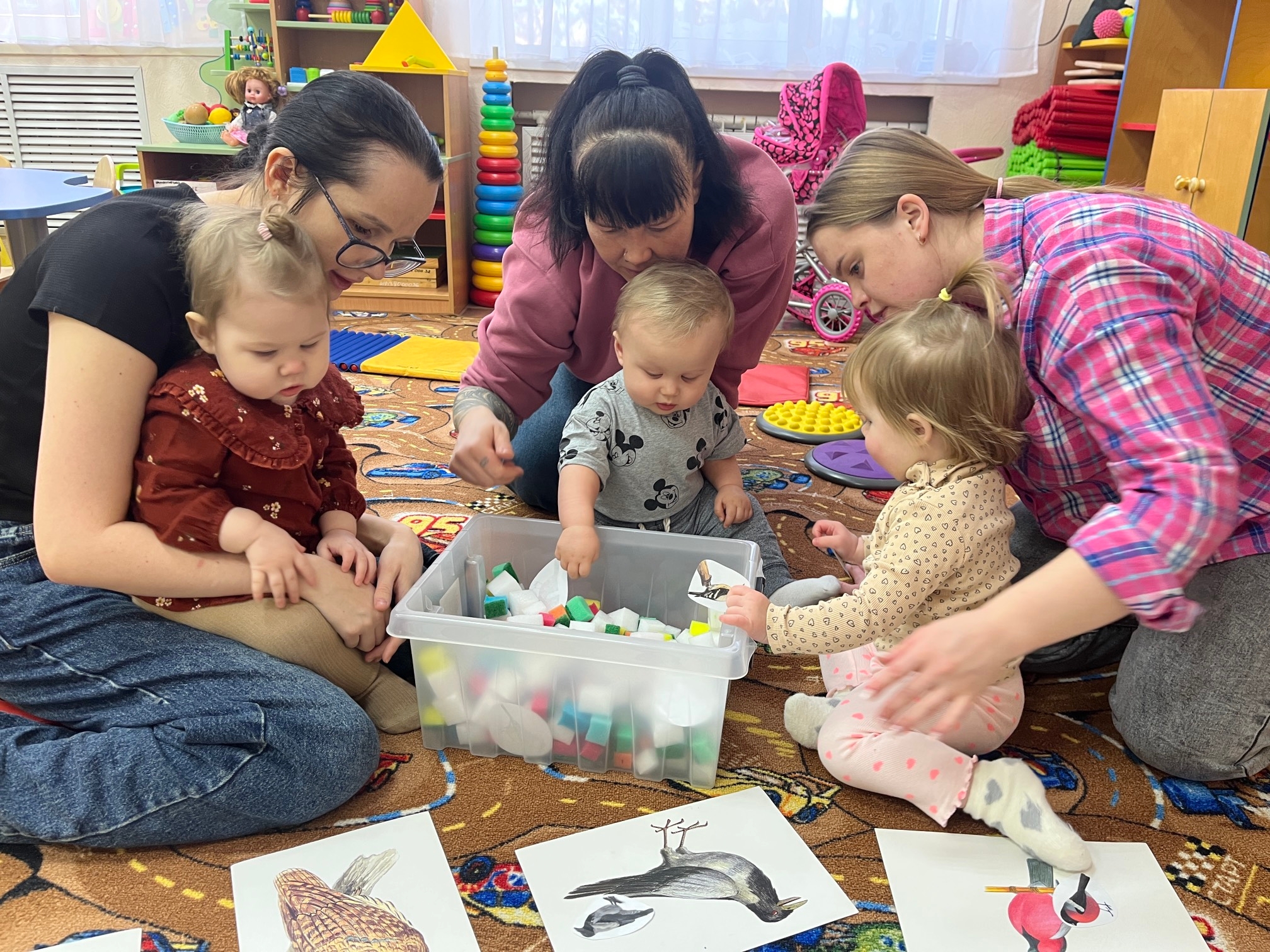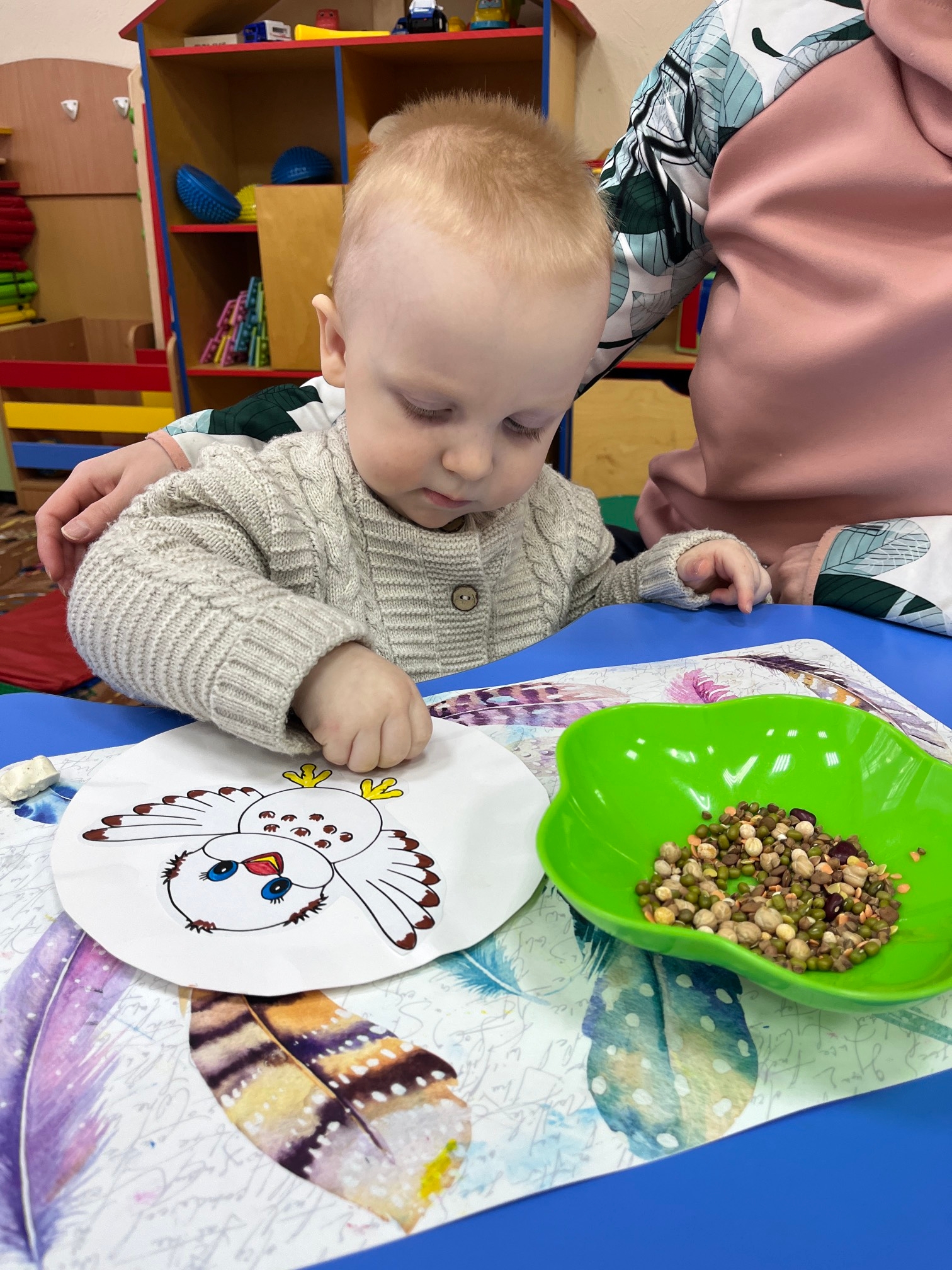 На занятиях по программе «Играем вместе» самые маленькие получатели социальных услуг совместно с мамами изучали зимующих птиц. Малыши узнали знакомого им снегиря, послушали как звучит его голос. Вспомнили и про ворону, и синичку. В волшебном сенсорном ящике им ловко удалось отыскать всех маленьких птичек и найти им дом. Завершилось занятие выполнением творческой поделки «Воробушек». Малыши вместе с мамами рисовали маленьких птичек и кормили их зернышками.