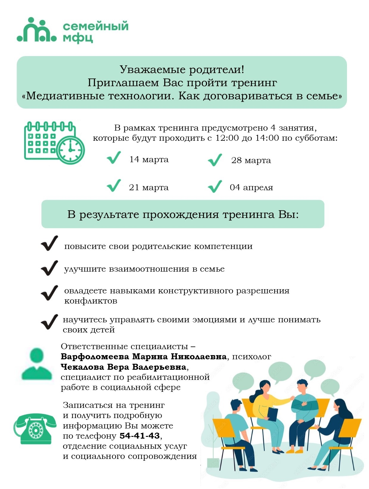 Приглашаем Вас на тренинг «Медиативные технологии. Как договариваться в семье»! В рамках тренинга предусмотрено 4 занятия, которые будут проходить по субботам с 12.00 до 14.00 час. по адресу ул. Энгельса, д. 61 (для достижения результата обязательно присутствие на каждом занятии).